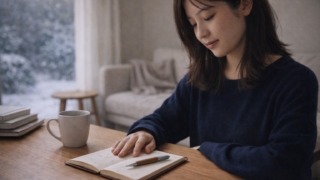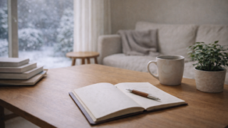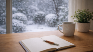 雪が積もった朝の静かな時間について綴った記事です。外の景色や家の中の温かさ、考えごとが少し減る感覚など、日常の中で気持ちが整う瞬間を記録しています。